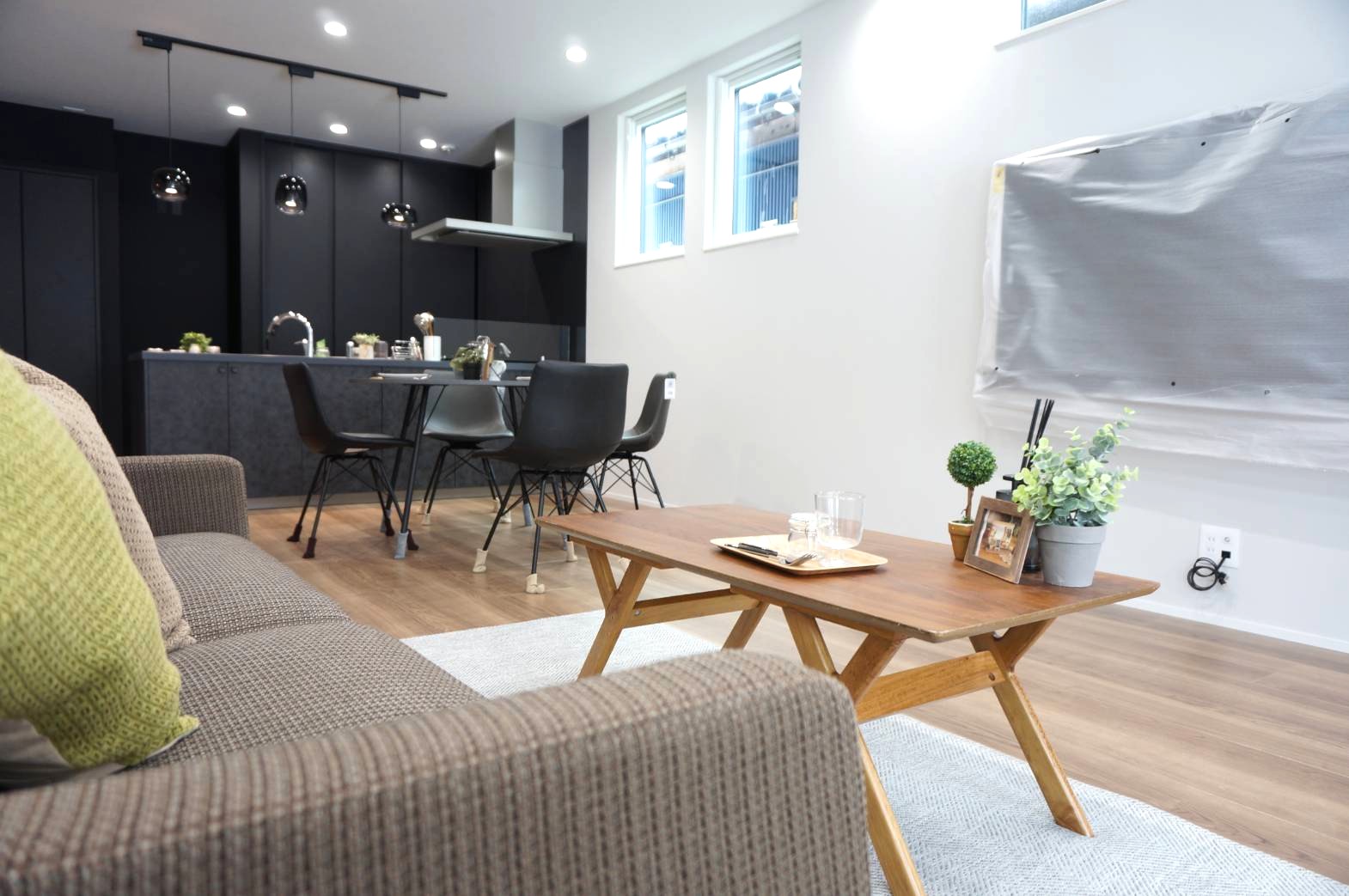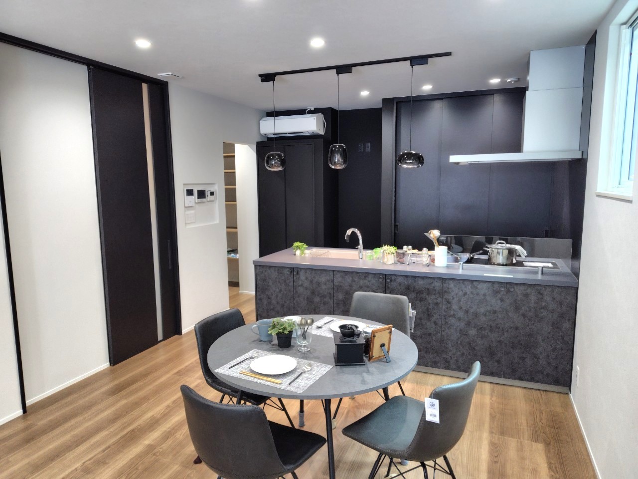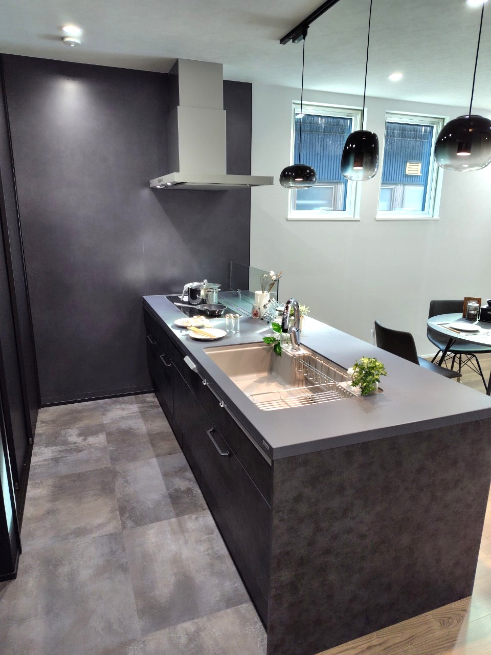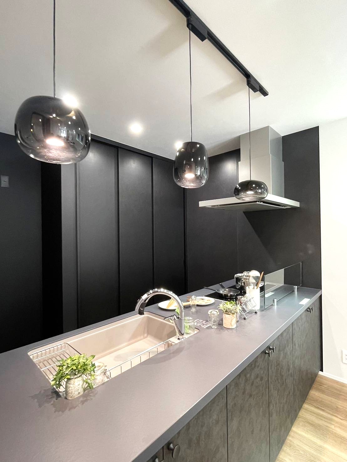 ブラック基調のスタイリッシュなキッチンは、重厚な背面収納と共に、空間を研ぎ澄まされた上質な印象へと導きます。キッチンからリビング全体を見渡せる設計により、料理中も家族の繋がりを感じられる住まいの中心を実現。