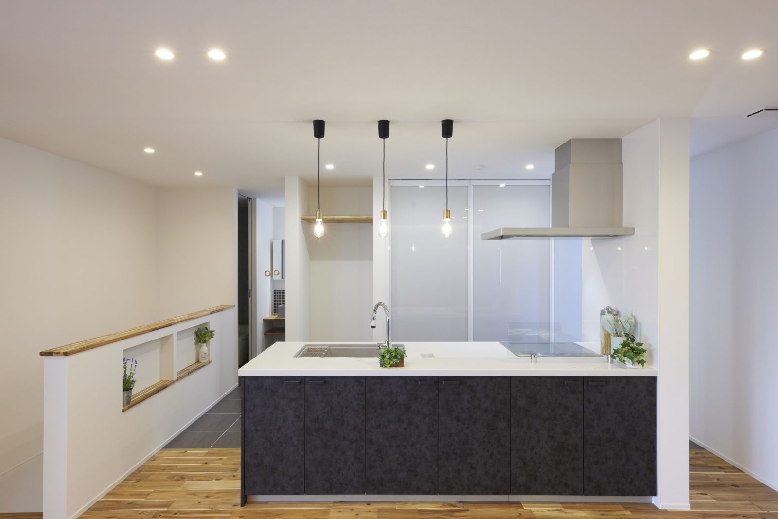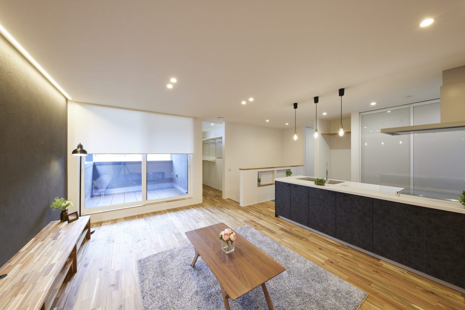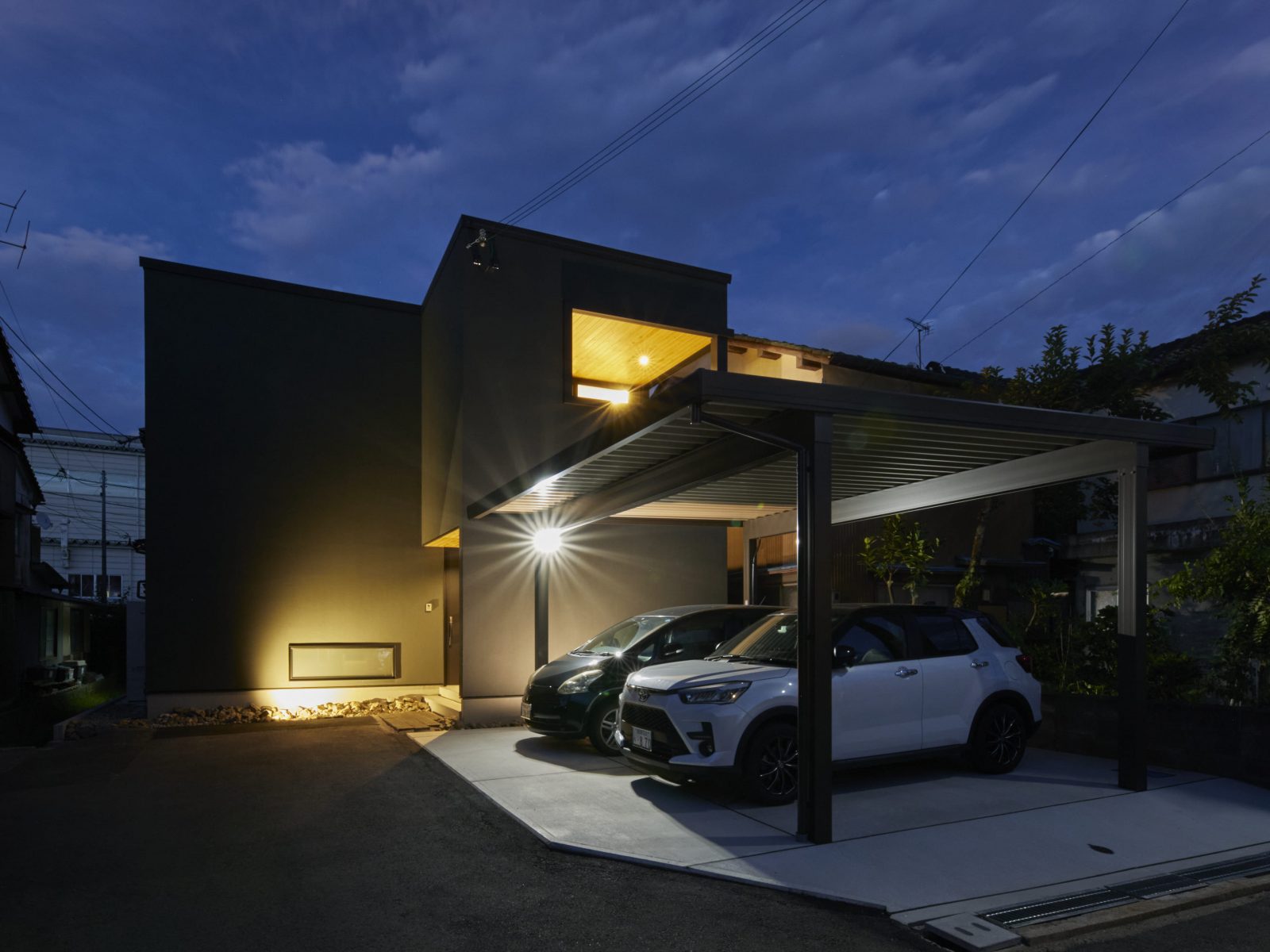 独自の風合いを放つ塗り壁の外装は、光の移ろいと共に豊かな表情を描き、街並みに洗練された存在感を刻みます。リビングを優しく包む間接照明は、素材の質感を鮮やかに際立たせ、オープンキッチンと共にスタイリッシュな空間を演出。内と外で光と素材が響き合い、住まい全体に圧倒的なデザイン性をもたらします。