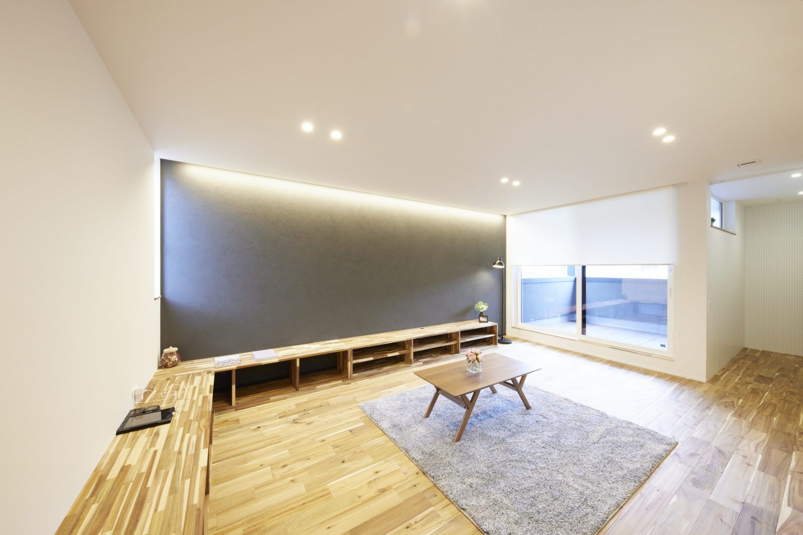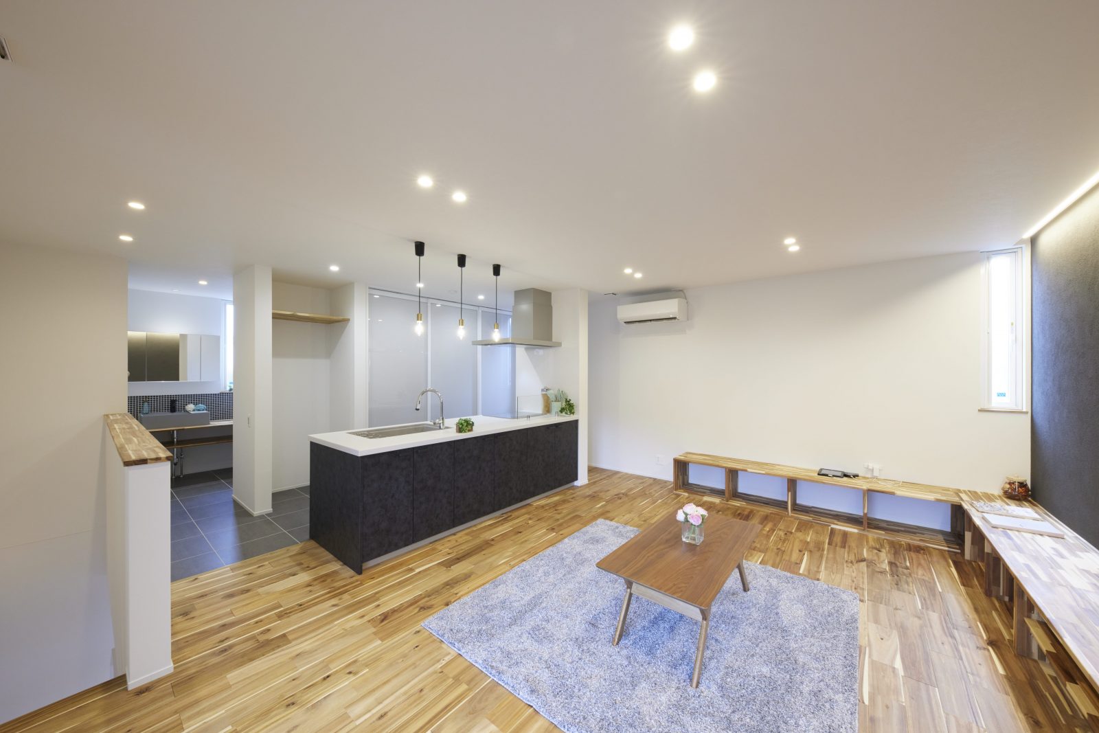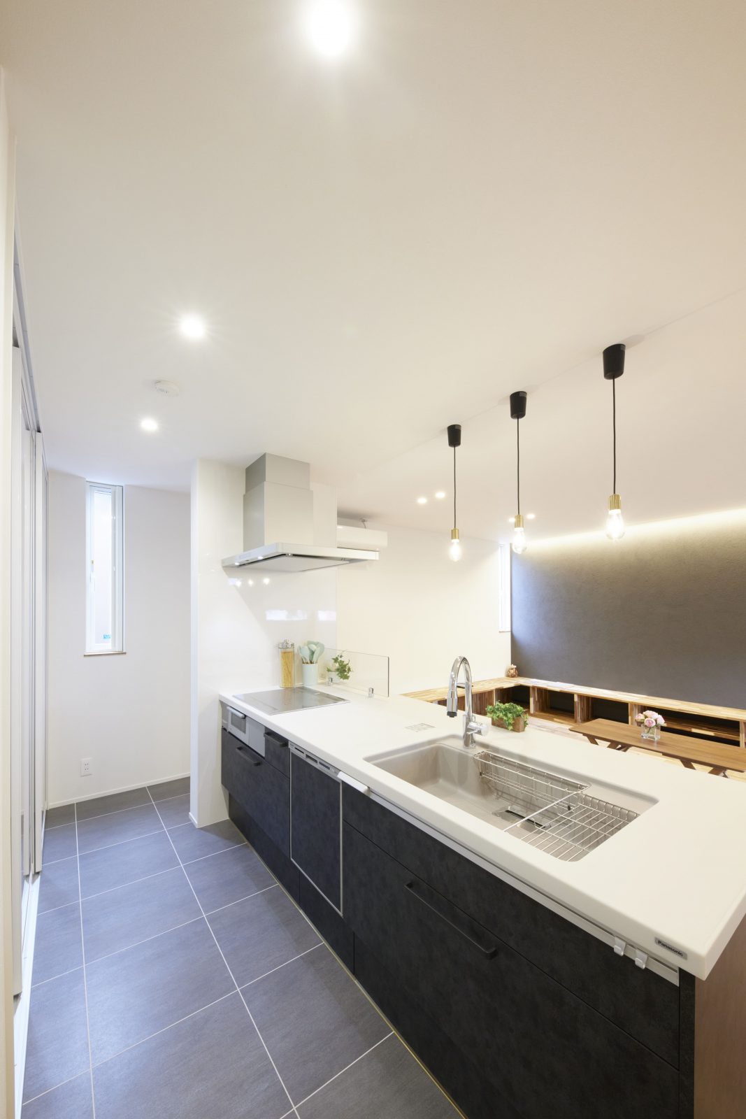 独自の風合いを放つ塗り壁の外装は、光の移ろいと共に豊かな表情を描き、街並みに洗練された存在感を刻みます。リビングを優しく包む間接照明は、素材の質感を鮮やかに際立たせ、オープンキッチンと共にスタイリッシュな空間を演出。内と外で光と素材が響き合い、住まい全体に圧倒的なデザイン性をもたらします。